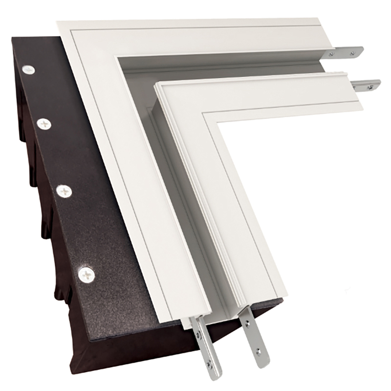 The TruLine 1A Dual L Power Channel Connector includes a WiZ Pro CV Bridgebox in a 4-Gang Junction Box, Lens, Channel Joiners, Adjustable Mounting Bars, two 90 Power Connectors, as well as Left and Right Power Connectors. Allows 24VDC power to be fed from corners for 90 degree turns (with power) in Picture Frame installations either in one or both directions. LED Strip (not included) installs on the side of the channel to create continuous illumination on a wall or ceiling.