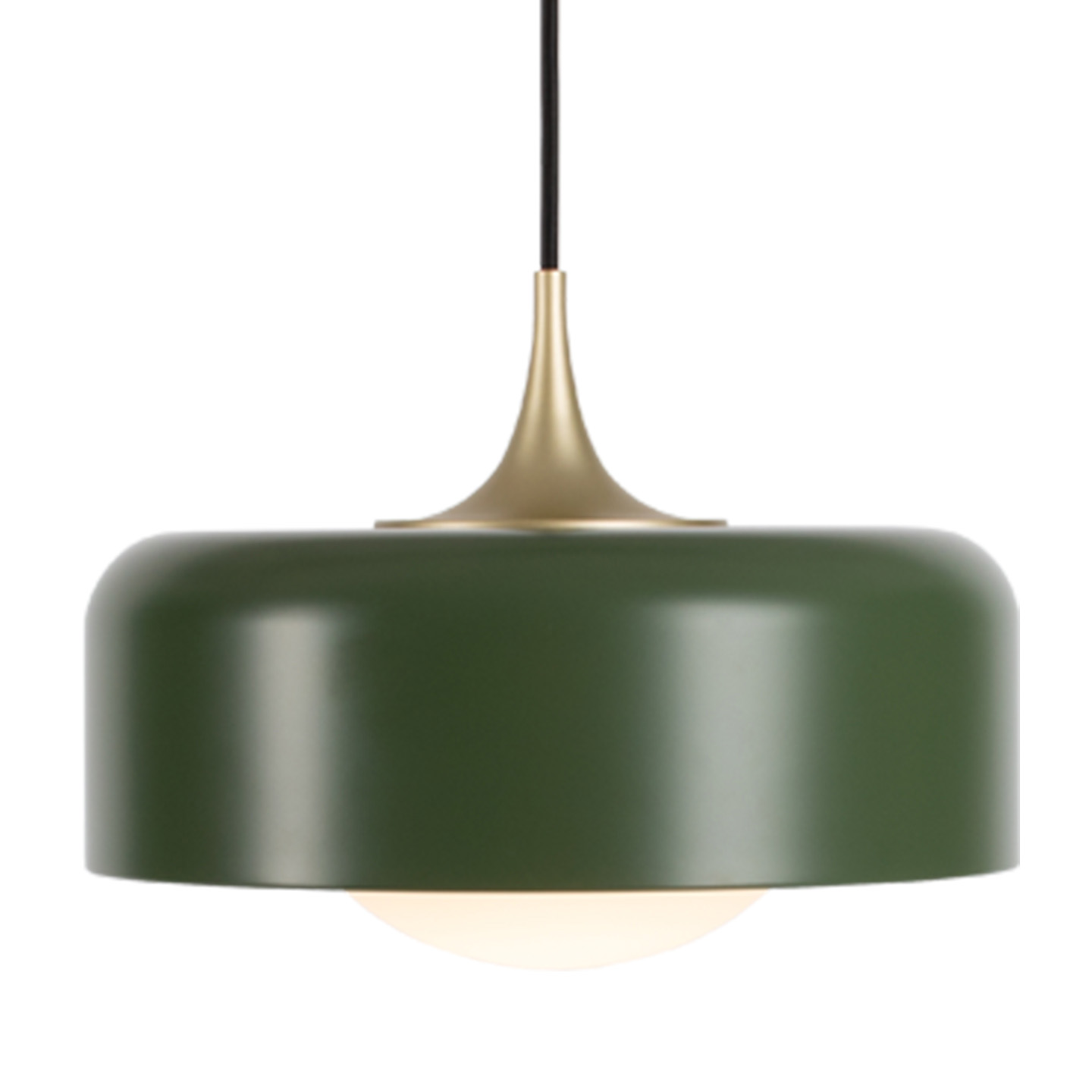 The Pensee Large Pendant is a refined, contemporary take on a classic silhouette, featuring a hand-crafted opal glass diffuser set under a delicate metal shade with elegant golden accent on top. This pendant emits a calming glow perfect for many settings, whether used individually or suspended in multiples.