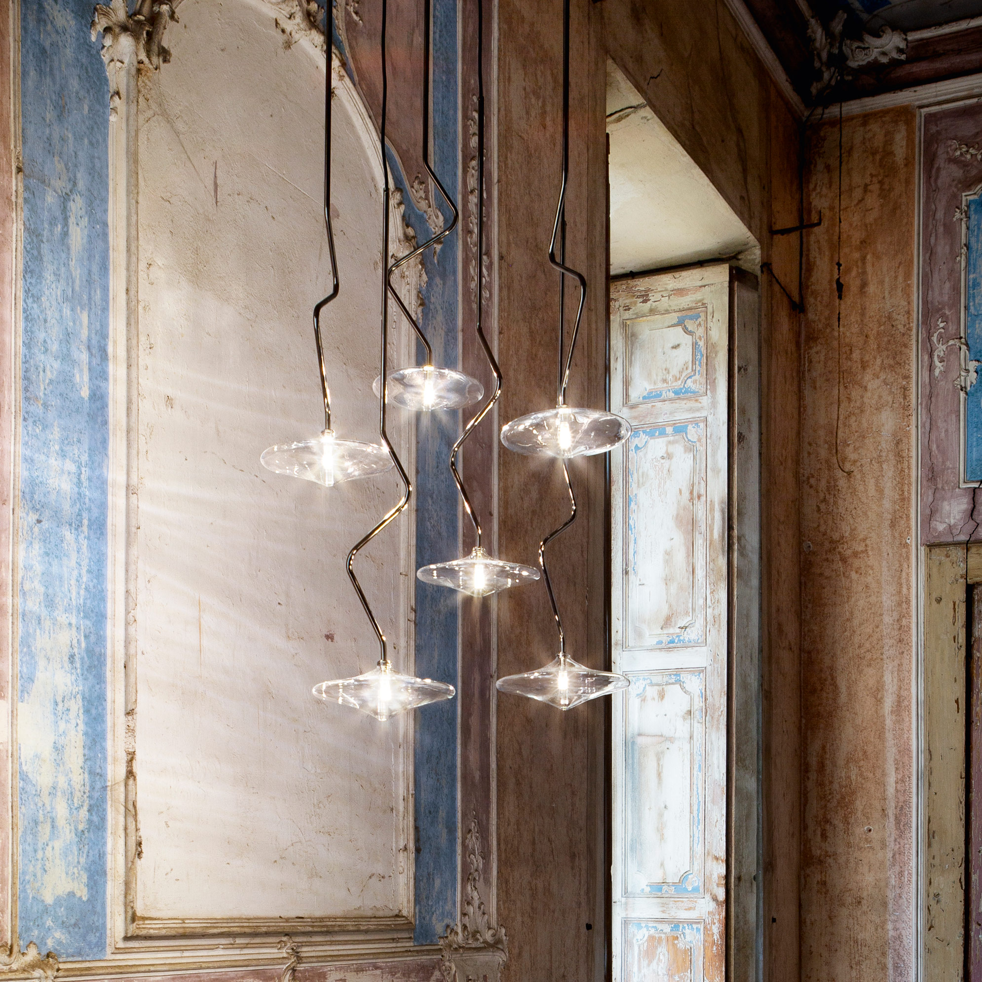 The Essenza Pendant reflects and amplifies ambient light creating a delicate and undefined lighting effect in which light and shadows are projected outwards according to the rules of refraction. Available with a Glossy Black finish complemented by Clear Borosilicate glass shades (three small and three large). CE listed.