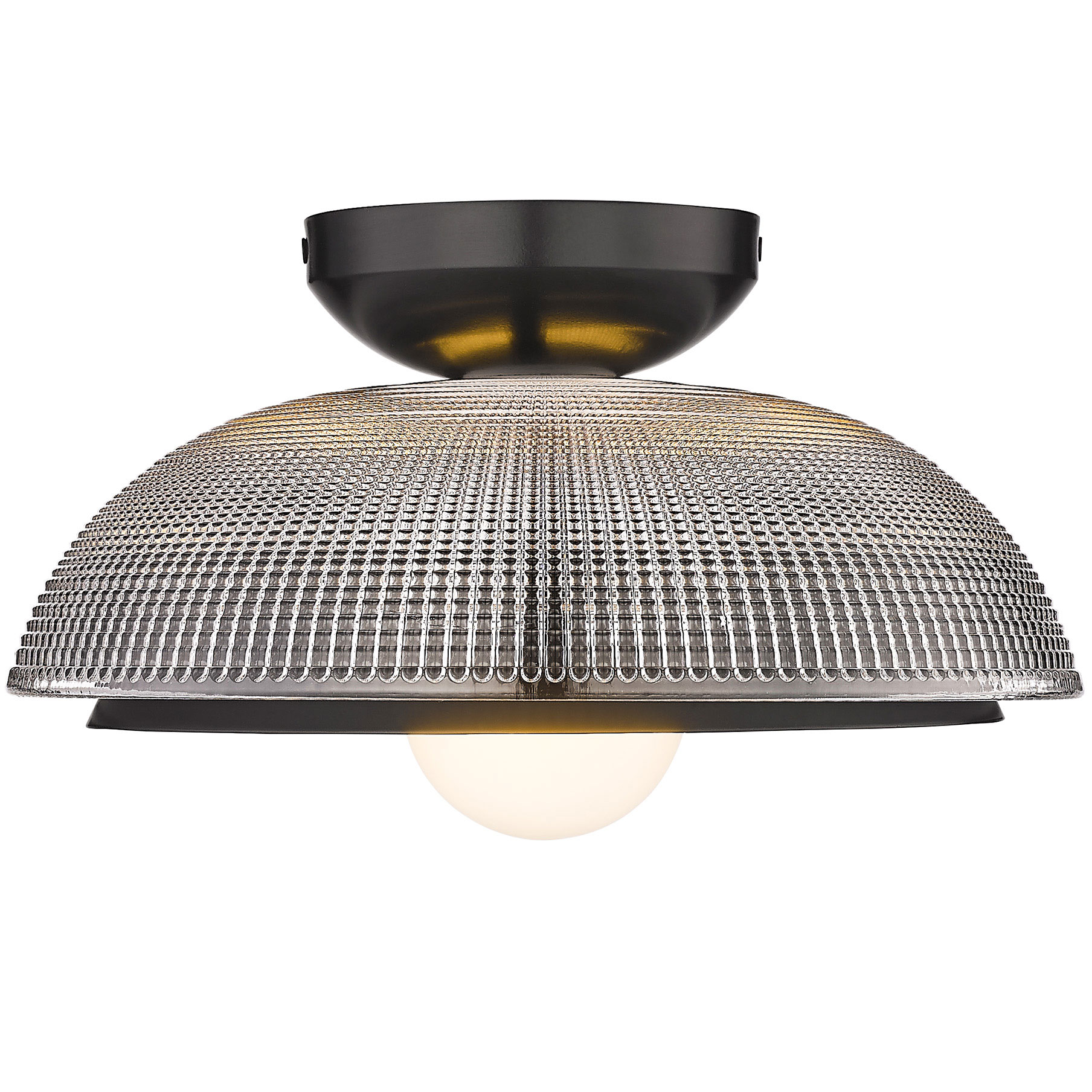 Evocative of the Art Deco style of the glamorous roaring twenties, this flirty, vintage-inspired design has mid-century modern elements. The textured Retro Prism Glass skirts the smooth shade for a layered look that is pure feminine sophistication. Complete the glam look of this damp-rated fixture with an oversized globe bulb.