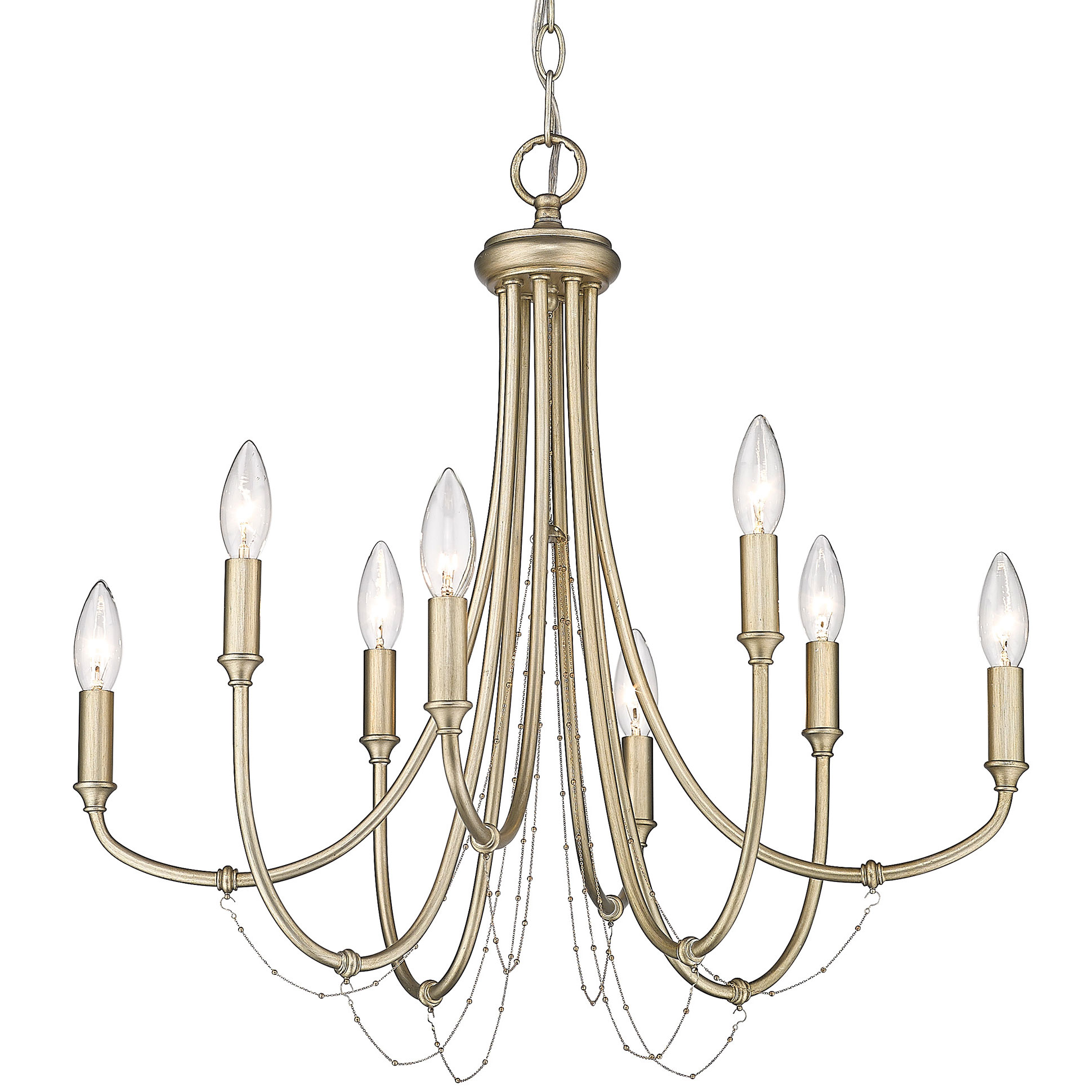 Modern elegance, Kamila is a contemporary update to traditional chandeliers. Pretty and feminine, Kamila was designed to liven conservative spaces. Decorative gold chains with small beads adorn the sweeping arms. Finished in a soft White Gold finish, the fixture features exposed bulbs and fashionable candelabras.