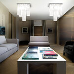 The Tubes Multi Light Ceiling Light features a cluster of rectangular mouthblown glass shades for a bold, geometric look. The varying heights of the shades recall the look of stalactites in a cave or an inverted cityscape of skyscrapers. Simple but striking, Tubes can serve as a dramatic statement piece in a foyer, lobby, or living area.