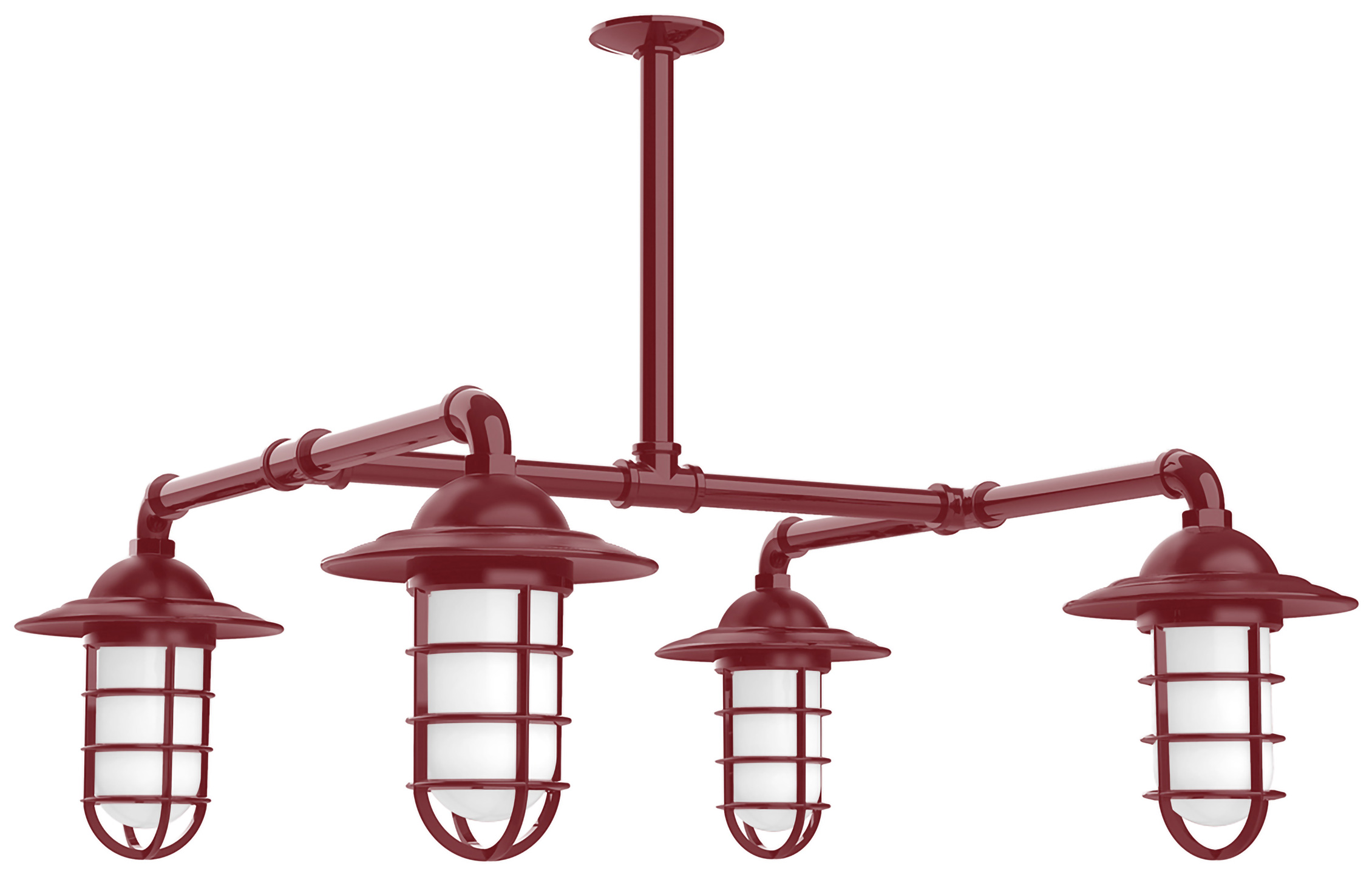 The Vaportite 4 Light Square Outside Pendant with Clear Glass brings a bold industrial style to your exterior space. The smooth frame is complemented with glass jars surrounded by nautical inspired cages, each with a cap that has a white powder coat interior, casting warm light across your space. A polyester powder coat finish provides color retention and scratch resistance.