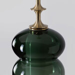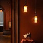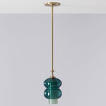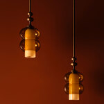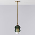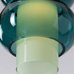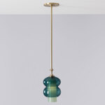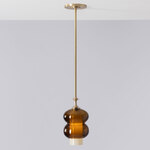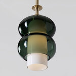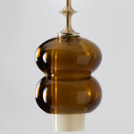 The Prince Pendant features a handblown, transparent glass shade with a double ellipsoid shape surrounding an opaque glass cylinder. Above the glass, the pendant's stem transitions into an organically curving, decorative profile which adds an elegant accent to the design. Prince's use of overlapping shapes and opacities offers a sophisticated aesthetic rich with subtle details.