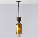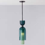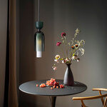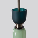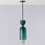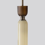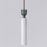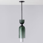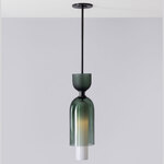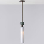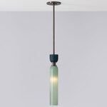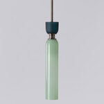 The Union Pendant combines upward and downward-facing glass domes in a variety of proportions, color palettes, transparencies, and textures for an elegant and sophisticated look. The lower glass portion is made of glossy opaque glass and illuminated from within to produce an ethereal glow. The upper glass dome is made of frosted glass, and the two pieces are separated by a brass band. The larger size also features a transparent dome surrounding the lower portion of the pendant, adding another layer of color and form to the design.
