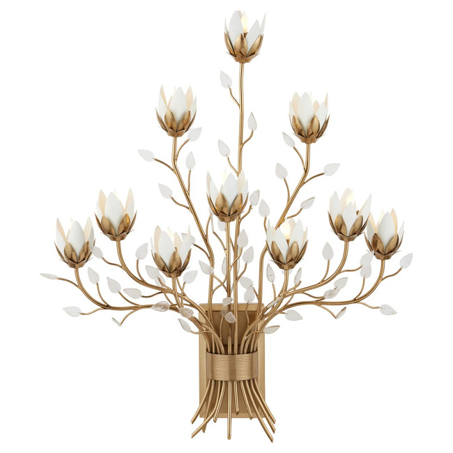 Like a wild spring bouquet, the Star Magnolia Wall Sconce is full of delicate, organic charm. Metal branches are covered in an antique brass finish and bound together before flowing upward and outward. Soft white glass petals are set in brass leaf bobeches and glow when illuminated. The smaller leaves fluttering from the branches are made of pressed glass, each of them handmade. Portions of the metal have been hand-hammered to add subtle texture to surfaces.