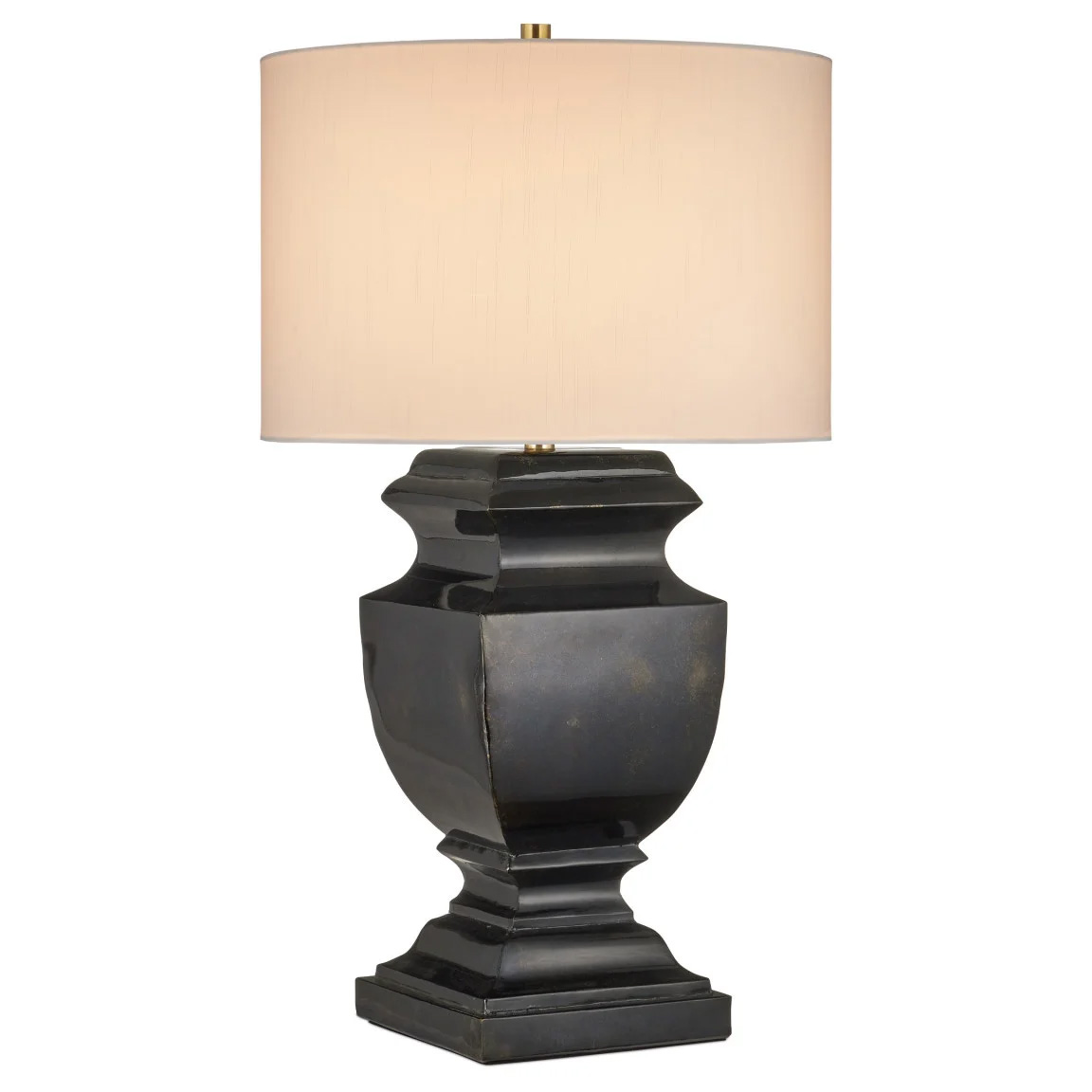 The Balustrade Table Lamp perfectly balances a classic silhouette with minimalist details. Crafted of iron in a traditional urn shape, the body has a distressed finish of light black with gold, covered with a high-gloss to create a sheen. Due to the artisanal finish, the surface of each lamp could differ slightly. 3-Way switch on socket.