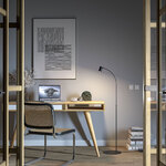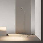 The Luxsi Floor Lamp features a slim stem with a slight curve at the top supporting a cylindrical lamp shade. The shade houses an integrated LED light source to provide warm, focused lighting. Foot dimmer switch located on cord.