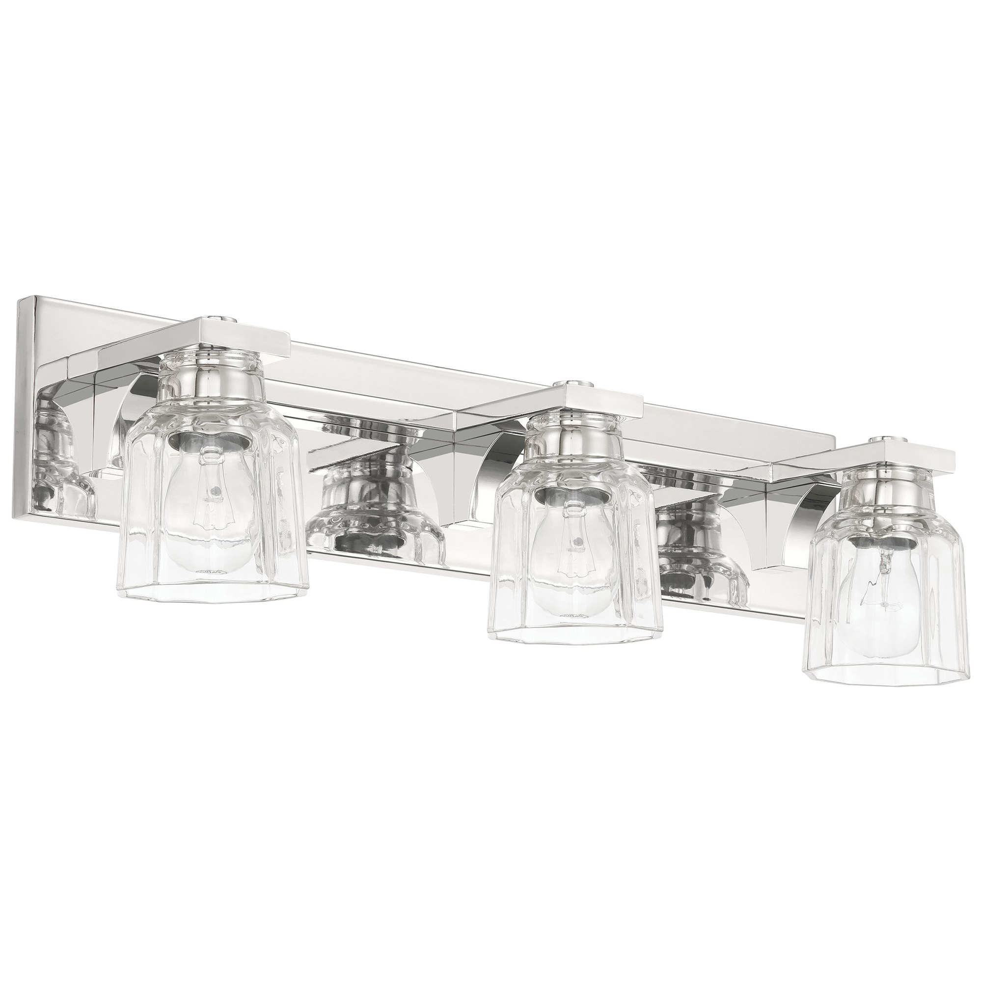 The Dryden Bathroom Vanity Light balances simplicity and modern style in this sleek sconce. Thick, faceted clear glass shades catch and bends light, bringing subtle movement and visual interest. Choose from a variety of bulb styles to change the overall look. Perfect for a powder room, main bath, or even hallway. Install with glass facing up or down.