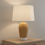 Warm, natural, and effortlessly elegant, the Freya Table Lamp brings a touch of romance to any room. Its sculpted base is wrapped in textured rope, grounded by a solid real marble foundation - each piece uniquely veined by nature. A brushed gold finish adds a soft, golden glow, beautifully complemented by the fabric shade that casts a warm, inviting light. Freya is more than a lamp, it's a love letter to organic beauty and timeless design. On/Off switch located on cord.
