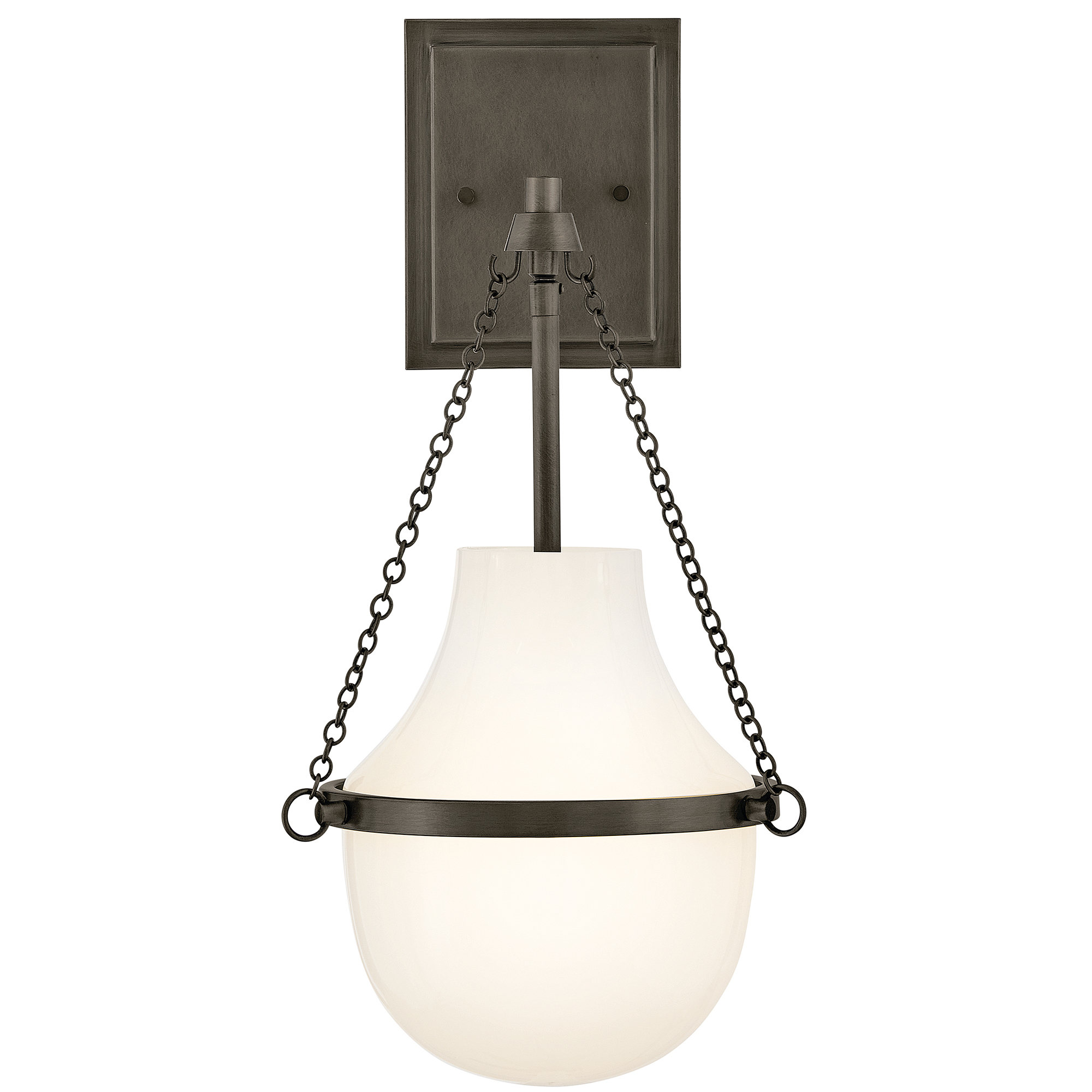 Fusing a sculpted, modern form with classically styled details, the Collins Wall Sconce features a transitional teardrop shade crafted from blown, Cased Opal glass. A central metal band and delicate chain uprights are available in several finishes.