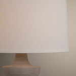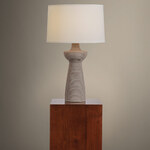 The sculptural silhouette of the Osgood lamp evokes a sense of grounded calm. Finished in a Raked Sand glaze, the ceramic base is balanced and inviting with dimensional curves. A decorative bobeche-like shape is integrated into the form, adding visual interest that bounces the light upwards. An off-white shade with self-trim and concealed Patina Brass hardware complements the earthy tones of Osgood. ON/OFF switch on socket.