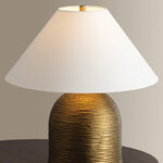 Made in India, Arvin introduces textural depth and warmth to a classic lamp form. There's a noticeable play of light and shadow across the ridged surface of the domed base, creating movement and dimension. Patina Brass fittings and an off-white linen shade complement the earthy lamp base. The inviting nature of Arvin makes it the perfect accent piece in coastal, transitional, or bohemian interiors. ON/OFF switch on socket.