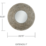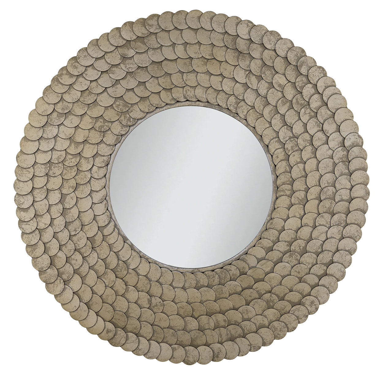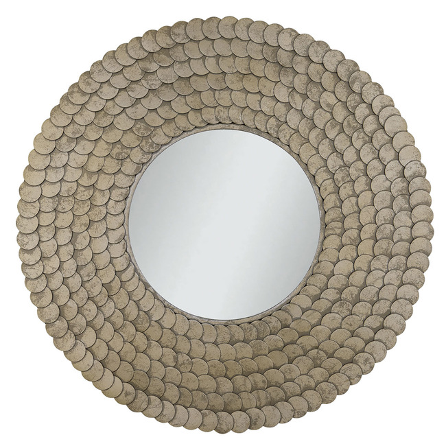 Hand-applied metal discs layer across the frame to create rich texture and depth in the Delphine 32.5 inch mirror. Finished in Grecian Pewter, each individual piece reflects light slightly differently, adding dimension and a subtle sense of movement to the round design.