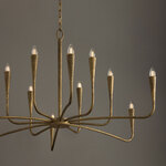 The Savari Grand Chandelier features a graceful, flowing form paired with a carefully crafted surface that highlights its artisanal quality. Each arm transitions seamlessly into the candle sleeves, creating a refined and cohesive overall look. Subtle design elements, including gently recessed sockets and elongated chain accents, contribute to its elevated and tailored appearance.