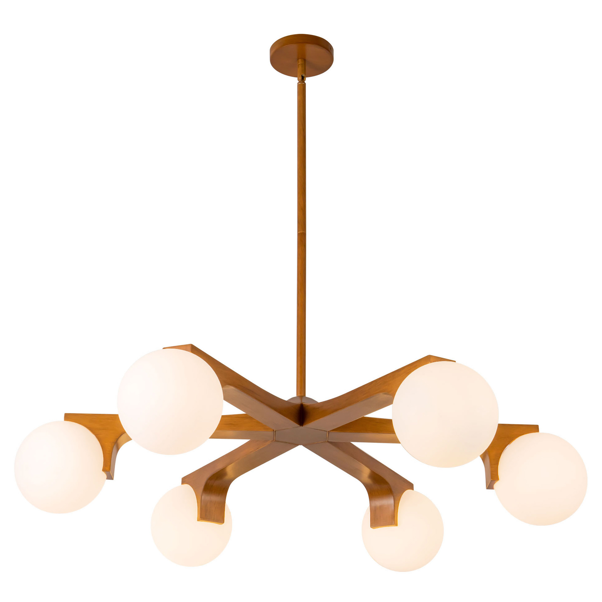The Briar Chandelier channels simplicity and timeless elegance. Drawing inspiration from mid-century modern design, sleek geometric arms support opal glass diffusers in a refined and understated way. Perfect for a dining room or kitchen nook.