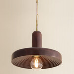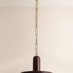 The Scheana pendant is carved from solid wood, with stem and shade merging into a single sculptural RLM shape. The concentric rings on the rippled surface catch the light in a tactile play of shadow and form. Finished with an Aged Brass chain, the rich materiality of Scheana brings artisanal beauty to any space. *Due to the one-of-a-kind nature of the medium, exact colors and patterns may vary slightly from the image shown.