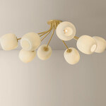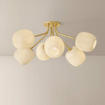 The Lisette family transforms simple geometric shapes into highly expressive compositions. The semi-flush ceiling light has staggered arms that branch outward in a radiant, bouquet-like arrangement. Each shiny cream opal glass shade features a delicate fluted edge. Finished in Aged Brass, Lisette's dynamic energy enlivens any space.