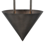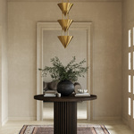 The Versus Pendant is a study in contrasting shapes, designed to be a dramatic interplay of form, shadow, and scale. Strong metal cones in a range of luxe finishes rise above a faux soapstone column. Each cone is lit from within to form layers of up lighting.