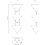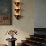 The Versus Triple Wall Light is a study in contrasting shapes, designed to be a dramatic interplay of form, shadow, and scale. Strong metal cones in a range of luxe finishes rise above a faux soapstone column. Each cone is lit from within to form layers of up lighting.