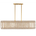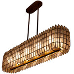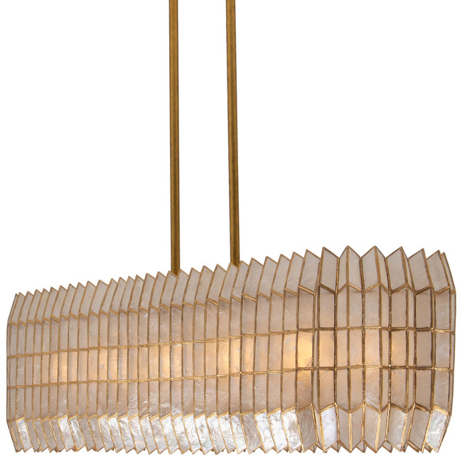 Drawing inspiration from origami, geometric designs, and the natural elegance of crystal cuts, the Fractal Linear Pendant showcases a captivating zig-zag frame pattern mirrored in the capiz shade's form. It emanates a gentle, warm glow that beautifully highlights its intricate design and understated shape. The piece is completed with a hand-applied Oxidized Gold Leaf finish, adding a touch of refined artistry.