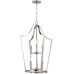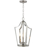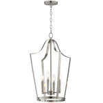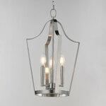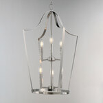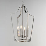 A classic bell-shaped lantern is reimagined with clean folding bands of flat sheet metal for a refined architectural look. Within the open silhouette, a cluster of candelabra lamps adds warmth and visual depth. The design balances traditional form with modern simplicity. Triac or ELV dimming.
