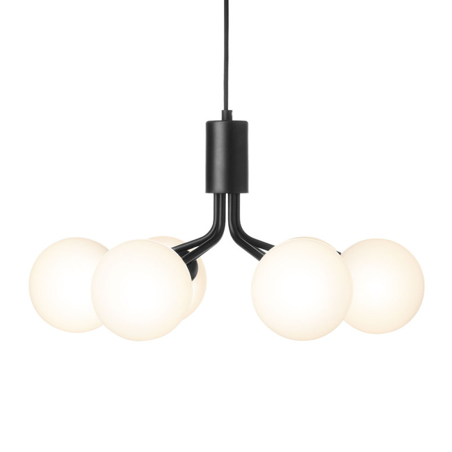 The Apiales Chandelier features an array of branching metal arms, each capped by a mouth-blown glass globe for a clean-lined, balanced look. The globes are available in smooth tinted or Opal glass for even light distribution, or textured optic glass for a more decorative touch.