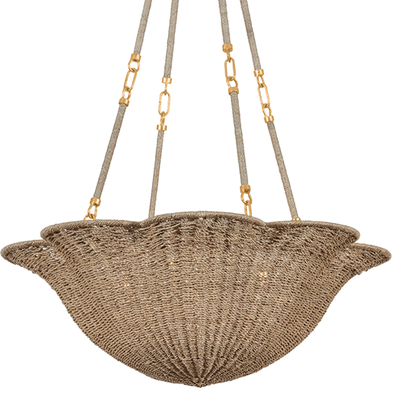 The Ardonia Chandelier pairs two trending design elements, scallops and naturals. Woven tightly from abaca fibers, the upward-facing tapered bowl shade has a petal-shaped edge to resemble a flower in bloom. The Vintage Gold Leaf frame is accented by an abaca-wrapped rod suspension, which points to the skill of the artisan craftsmen.