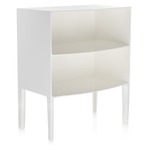 Ghost Buster Commode is available in Opaque Glossy White, Transparent Clear Crystal or Transparent Smoke Grey. Starck has taken a new look at it and the Kartell style commode evokes the lines of classic furniture while its transparency and plastic material give it a contemporary voice. Corners and curves, straight lines and sinuous play over its surfaces and give life to an intriguing game of eye-catching perspectives and reflections. Ghost Buster with three open front shelves and four bi-facial legs is the largest plastic monobloc ever yet made in the world of furnishings. 26.77 inch width x 31.5 inch height.