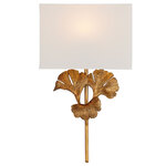 Gingko Wall Light is perhaps underrated in the realm of botanical-inspired motifs. Featuring a White Shantung shade and made of wrought iron with a chinois antique gold or silver leaf finish. One 13 watt, 120 volt Compact Fluorescent GU24 base bulb is required, but not included. 14 inch width x 25 inch height x 4 inch depth. ADA compliant.