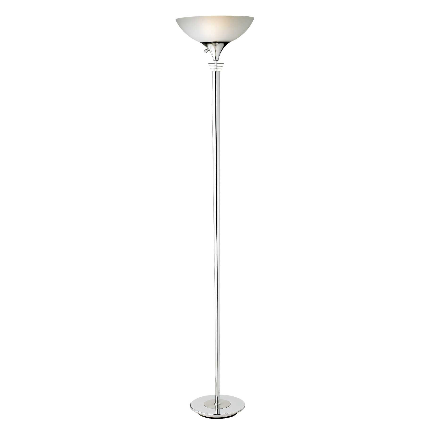 The Metropolis Floor Lamp features a Frosted glass shade and a Chrome or Black Nickel finish. Two 150 watt 120 volt A19 medium base bulbs are required, but not included. 14 inch width x 71.5 inch height.