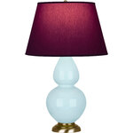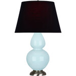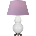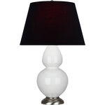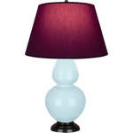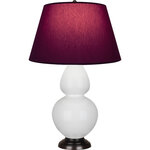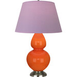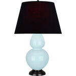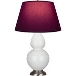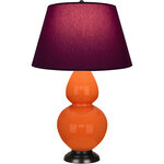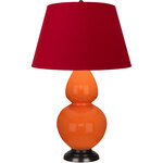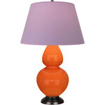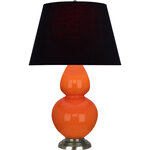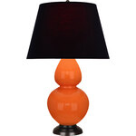 The Double Gourd Table Lamp adds a bold decorative look to your interior space. The gracefully curving ceramic body rests on a round metal base with matching final, and is topped with a colorful, lined shade that casts warm light across your room. The shades with a colored interior lining create a gradient effect on the lamp's body when illuminated. Full range dimmer switch is located on the lamp socket.