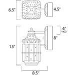 Nantucket 30081 Outdoor Wall Light is a traditional, early American piece that fits into a variety of decor. Features Seedy glass with a Country Forge finish. One 100 watt, 120 volt A19 medium base bulb is required, but not included. Wet location rated. 6.5 inch width x 13 inch height x 8.5 inch depth.