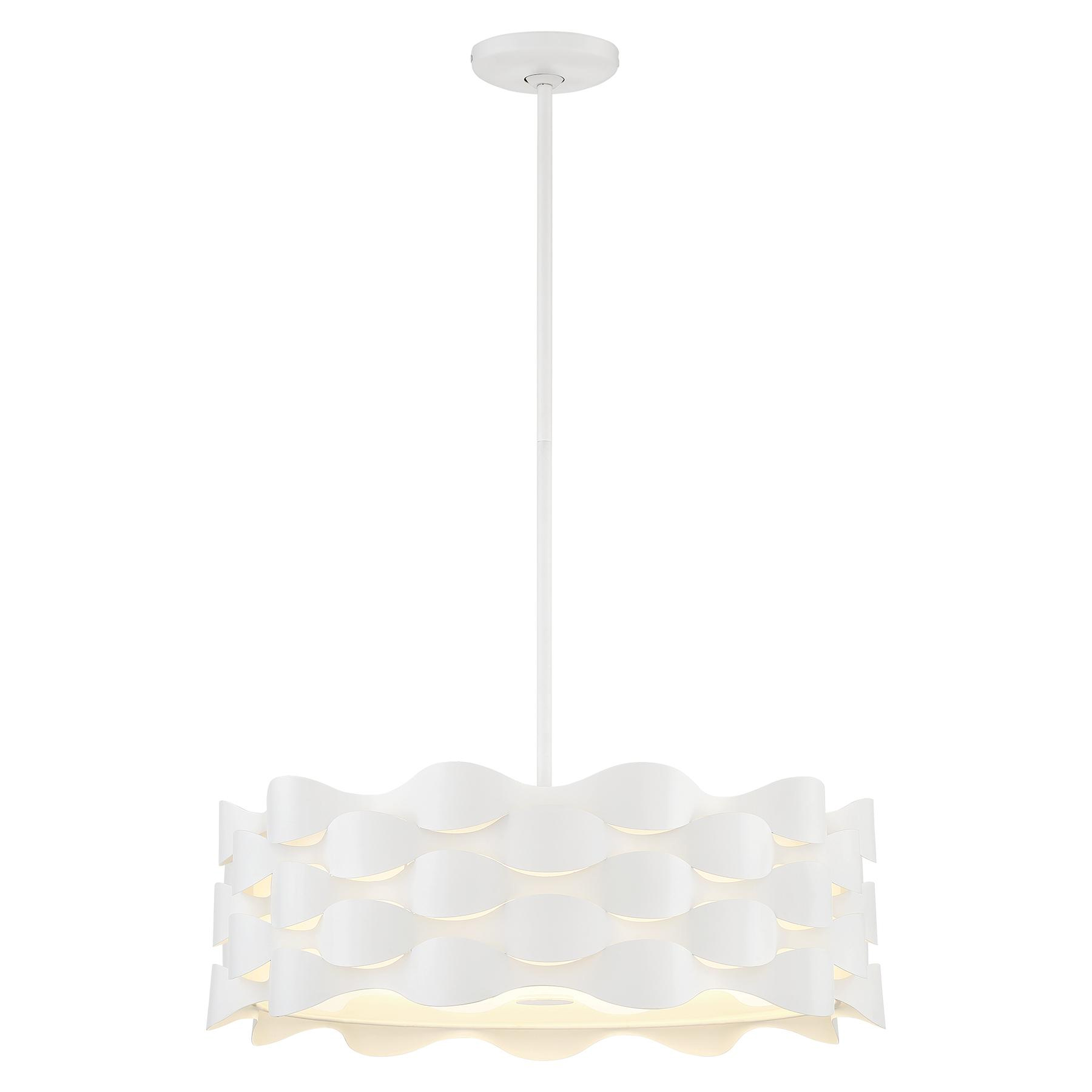 The Coastal Current Pendant brings a bit of the ocean to your interior space. The waved Sand White metal shade with an inner White linen shade and White etched glass bottom diffuser, is a clean decorative addition to your home. Canopy: 4.88 inch diameter. ETL listed.