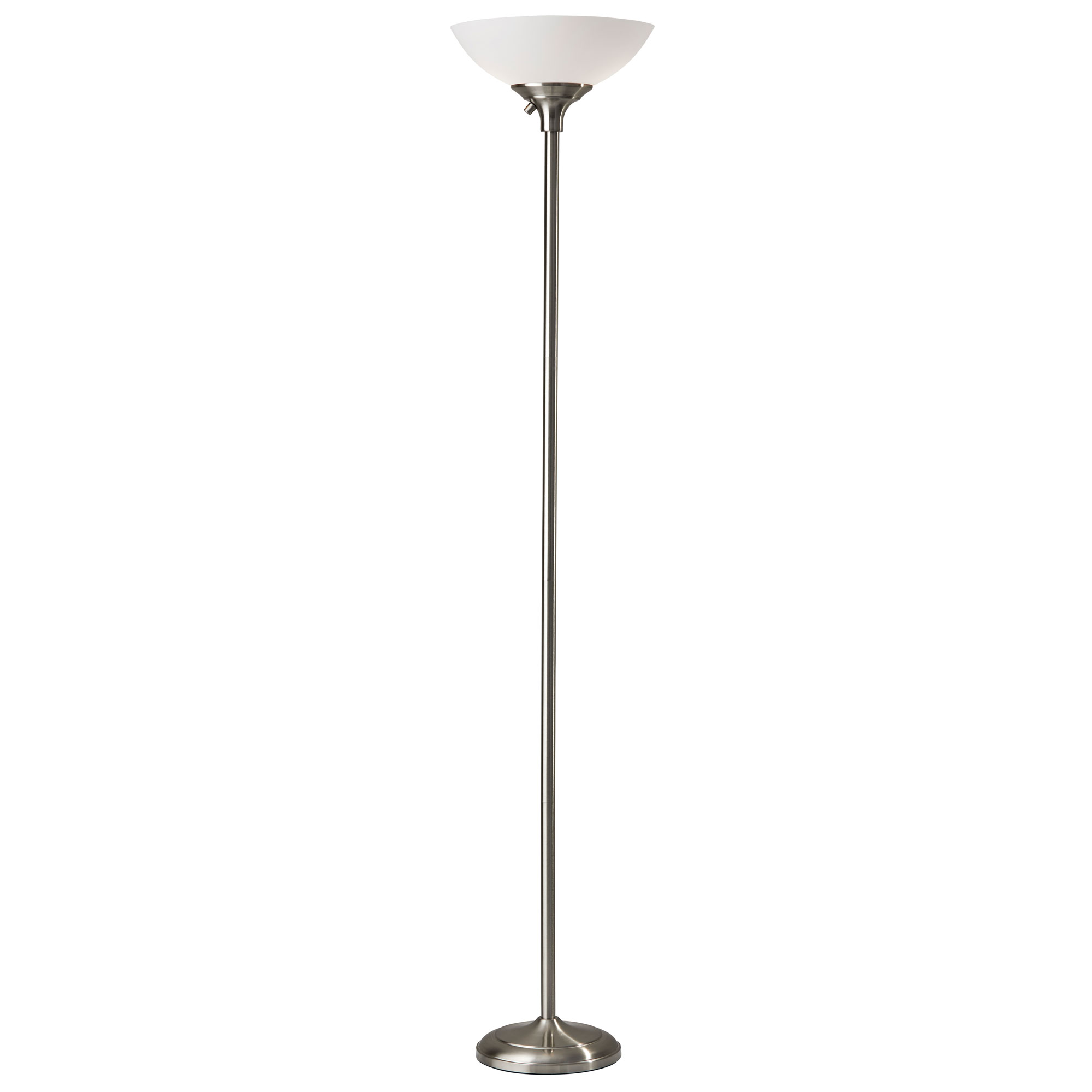 A simple, classic style, the Glenn Torchiere is easily placed into a variety of decor and spaces. A Matte Black, Antique Brass, or Brushed Steel finished pole extends into a Frosted bowl shade that reveals a beautiful glow when lit. Two 150 watt bulbs provide ample room illumination- more than any other torchiere on the market.