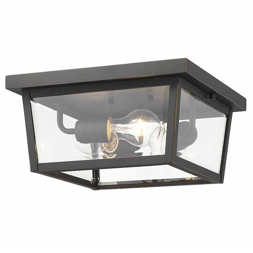Beacon Outdoor Ceiling Flush Light brings a simple classic look to any exterior space. Features Clear beveled glass with an Oil Rubbed Bronze finish. Damp location rated. ETL listed.