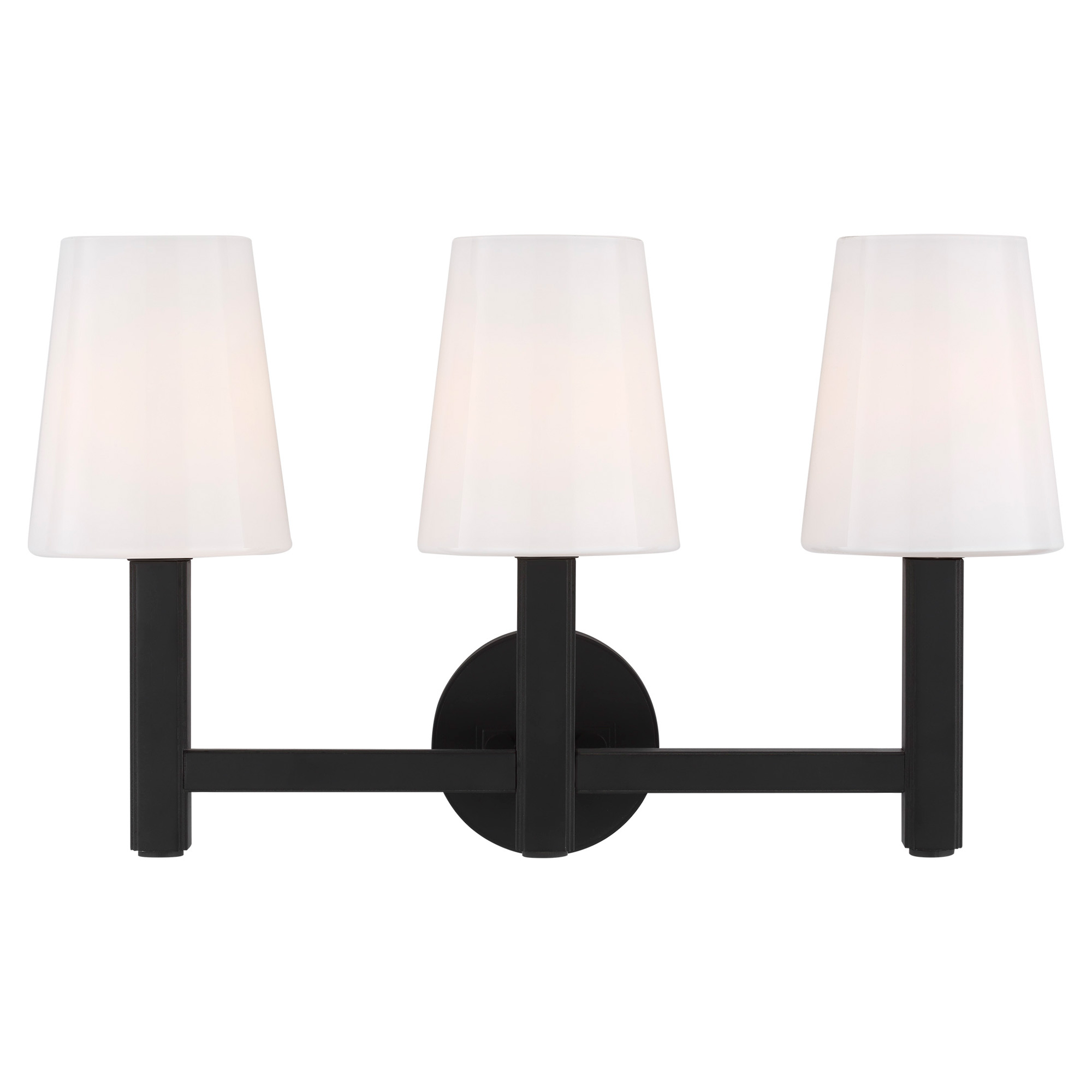 The Logan Vanity Light offers a sleek, contemporary look featuring tapered Milk White glass shades atop slim arms set along a horizontal beam and into a round backplate. cETL and ETL listed for damp locations.