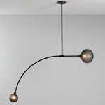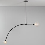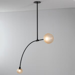 The Balance 1.0 Pendant's sculptural aesthetic is rooted in minimalism. A metal frame supports two handmade spherical glass diffusers that feature the signature SkLO double-dipped, fire-polished mouths which show where the glass is broken from the blower's pipe, making each one unique.