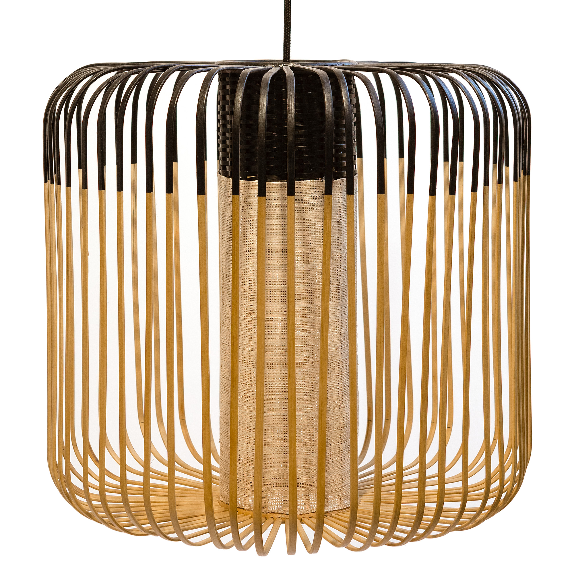 The Bamboo Outdoor Pendant ties together modern design with organic warmth to create a wonderful addition to your exterior space. A drum shaped silhouette constructed from slender bamboo blades gracefully curve around a cylindrical diffuser and give the Bamboo it's striking profile. Add this artisan charm to your front porch to welcome you home, or on the back deck to light up your night. Finished with Red, Black, Green, or White bamboo. Available in three sizes. Damp location rated. Canopy diameter 4.5 inches. UL listed.