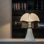 The Pipistrello Medium Table Lamp is a chic lamp that features a sleek stainless steel structure topped with a White Opal methacrylate diffuser with an an adjustable neck that allows for the lamp to be taller or shorter at will. Dimmer switch located on cord.