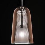 The Artusi Suspension features with a double bell shade and a Metallic Copper external finish that recalls haute cuisine equipment. Inside, a white frosted glass sphere hides concealing the light source.